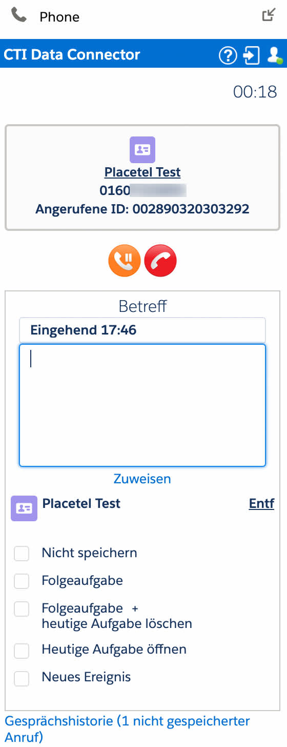 - Einschränkung: Bei der Nutzung des CTI Clients anstelle eines Hardware-Telefons können Sie eingehende Anrufe nur durch den CTI Client annehmen und ausgehende Calls nur über das Salesforce Plugin tätigen, wenn Sie möchten., dass diese in Salesforce getrackt werden.