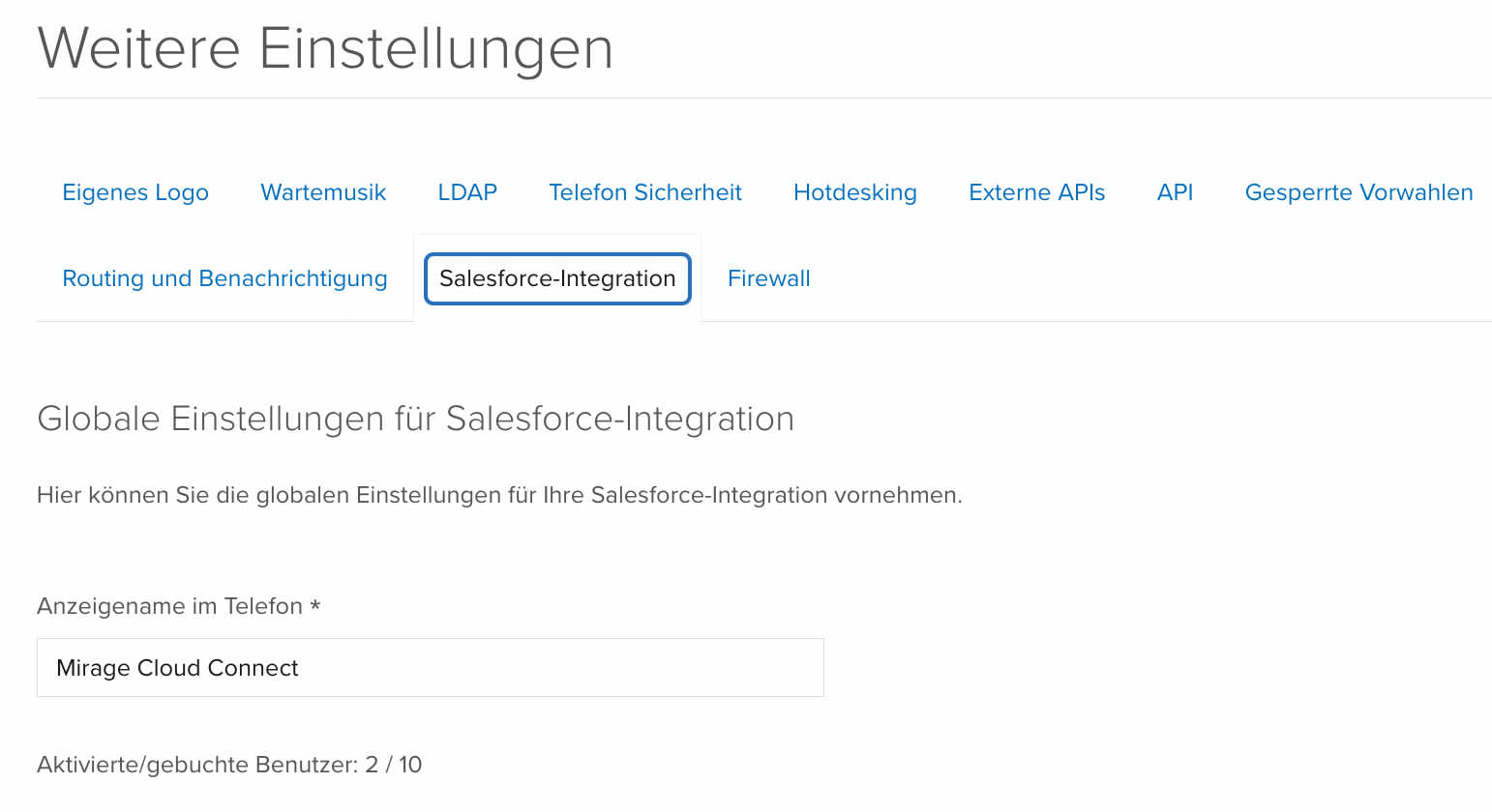 - Login als Administrator, wählen Sie Administration → Einstellungen. Wenn Sie den abgebildeten Tab mit Salesforce-Integration sehen ist Ihre Integration erfolgreich freigeschaltet. Im Feld Anzeigenamen im Telefon können Sie bestimmen, wie Ihr Benutzer auf dem Telefon, welcher für Salesforce verwendet wird, heißen soll. Diese Einstellung wird global auf alle Telefone im Konto mit Salesforce Unterstützung ausgerollt.