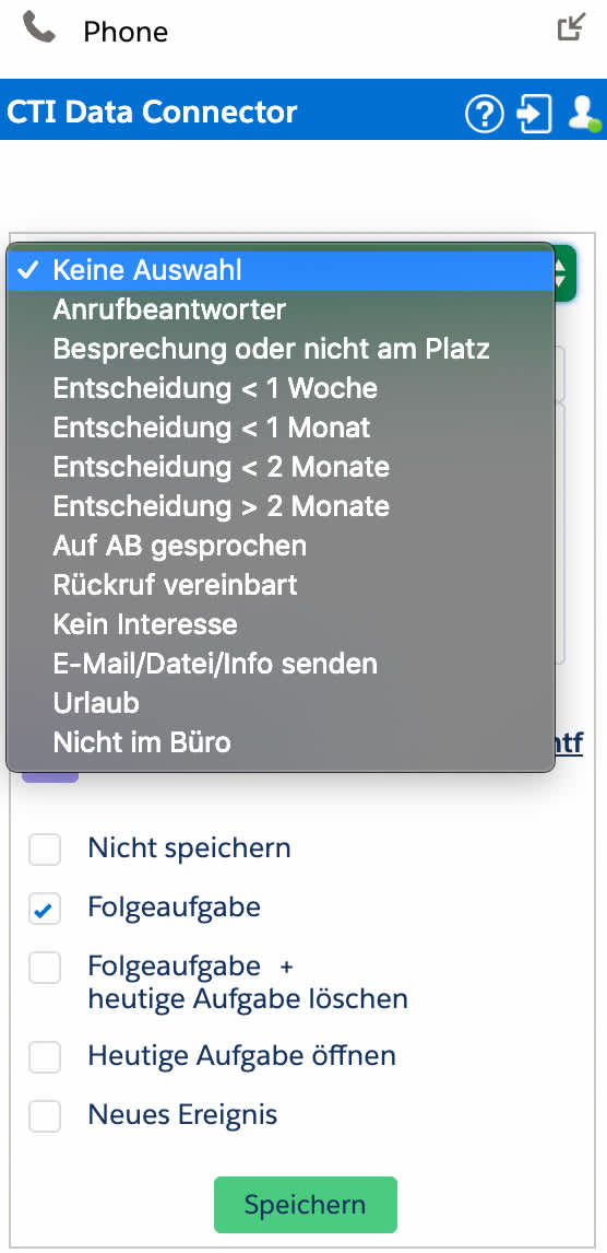 - Automatisches Speichern von (Telefon-)Notitzen als Aktivität mit weiteren Zusatzinformationen wie z.B.: Gesprächsergebnis, (konfigurierbare Auswahlliste) und Anruftyp (eingehender / ausgehender Anruf)