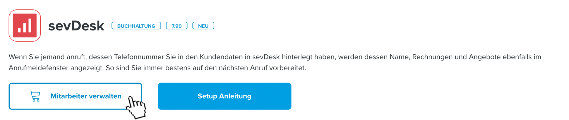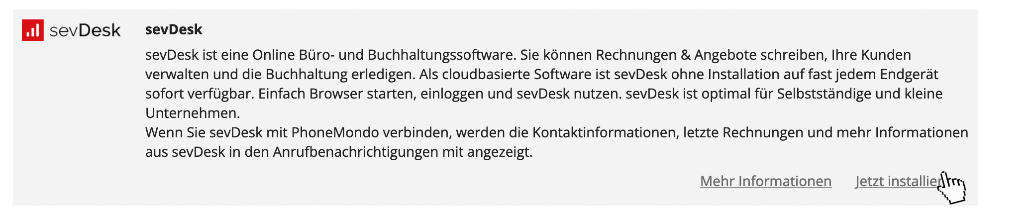 PhoneMondo: Add-On jetzt installieren - PhoneMondo: Wechseln Sie zu Addons, scrollen Sie zu sevDesk und klicken Sie auf Jetzt installieren.