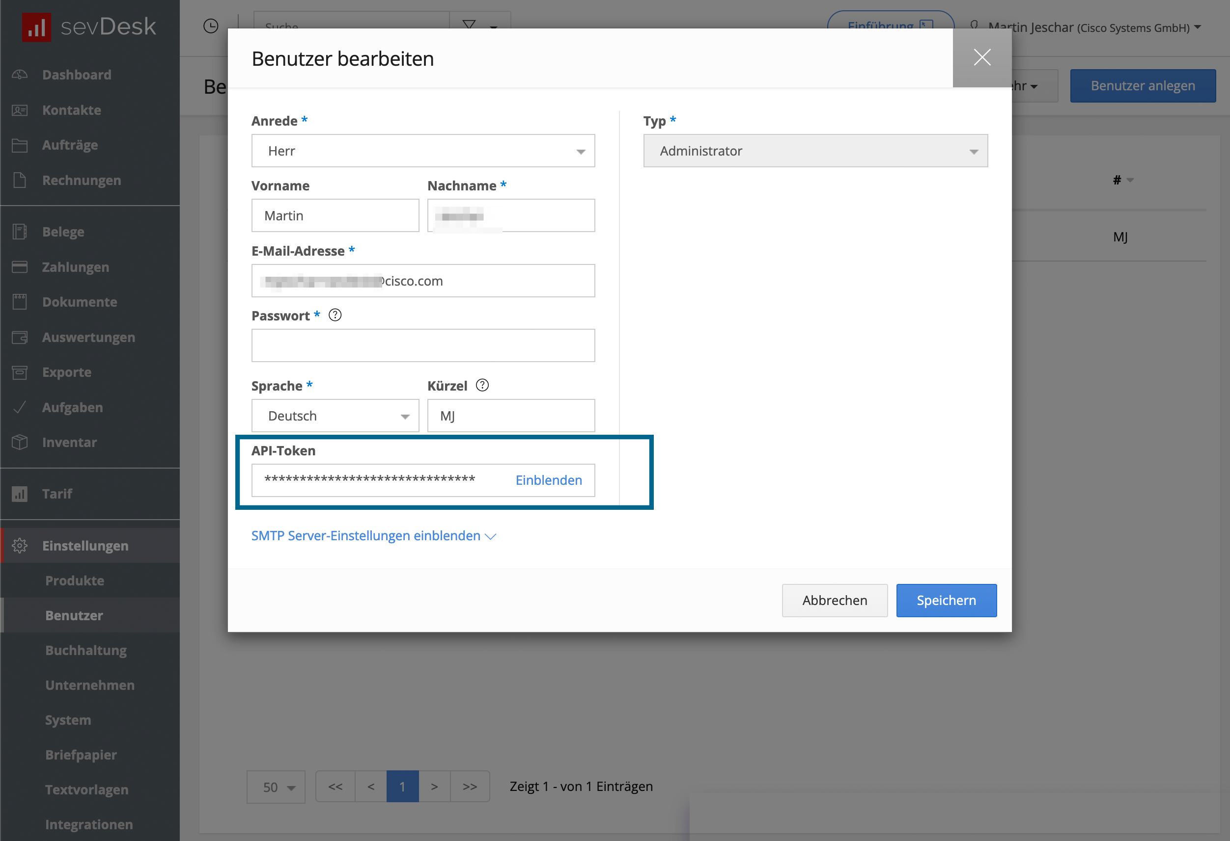 sevDesk: sevDesk API Token eintragen - Ihr sevDesk Account ist verbunden.