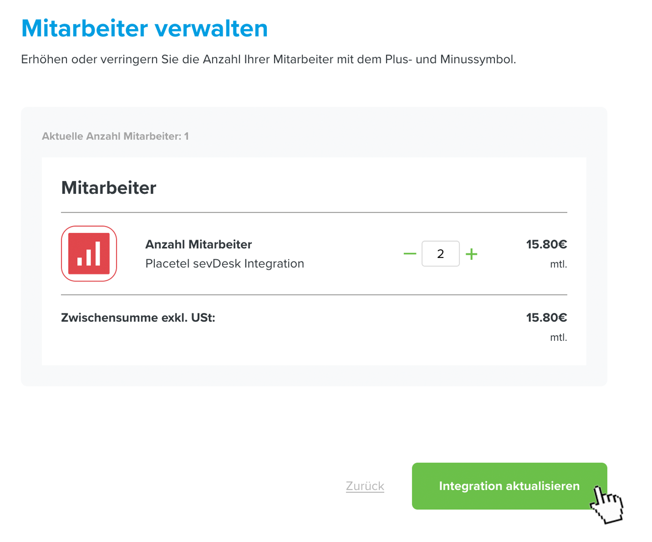 Placetel: Mitarbeiter verwalten - Erhöhen Sie die Anzahl der gewünschten Mitarbeiter.