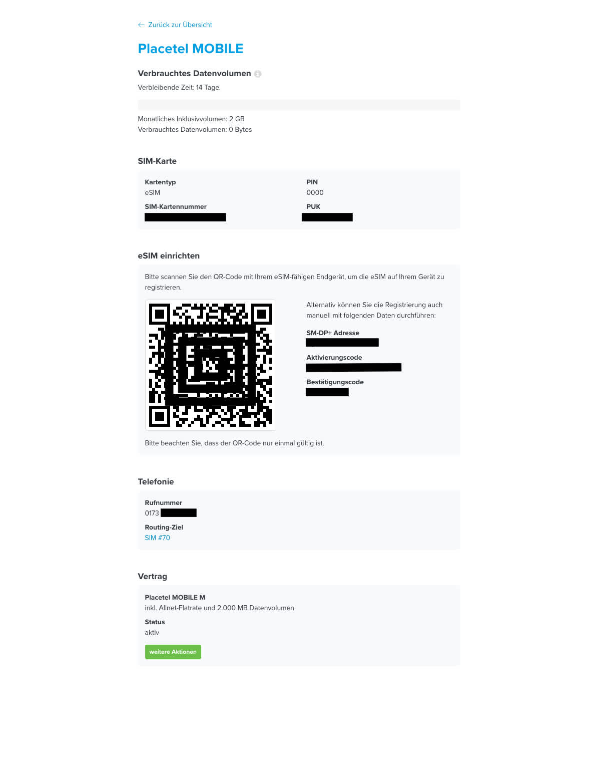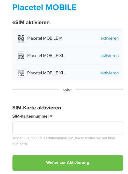- eSIM-Karten können hier direkt per Klick auf den nebenstehenden aktivieren-Button aktiviert werden.