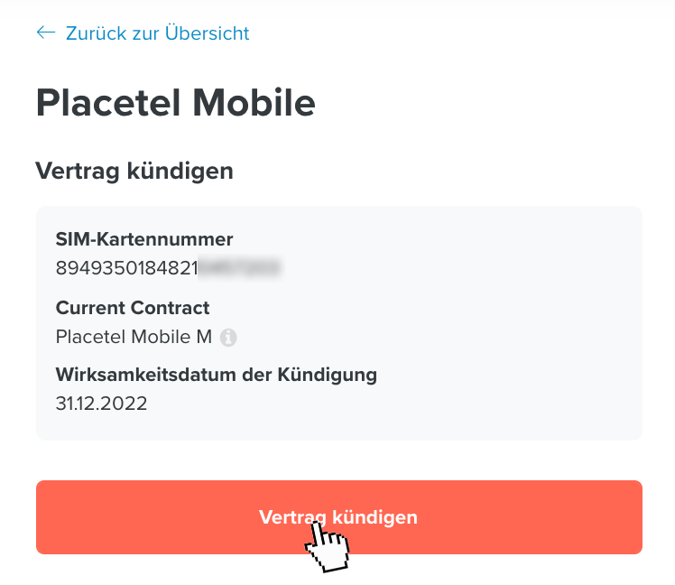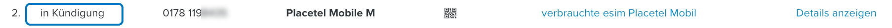 Um einen Placetel Mobile Vertrag (und somit auch die SIM-Karte) zu kündigen, klicken Sie zunächst auf Details anzeigen neben der entsprechenden Karte, die Sie kündigen wollen.