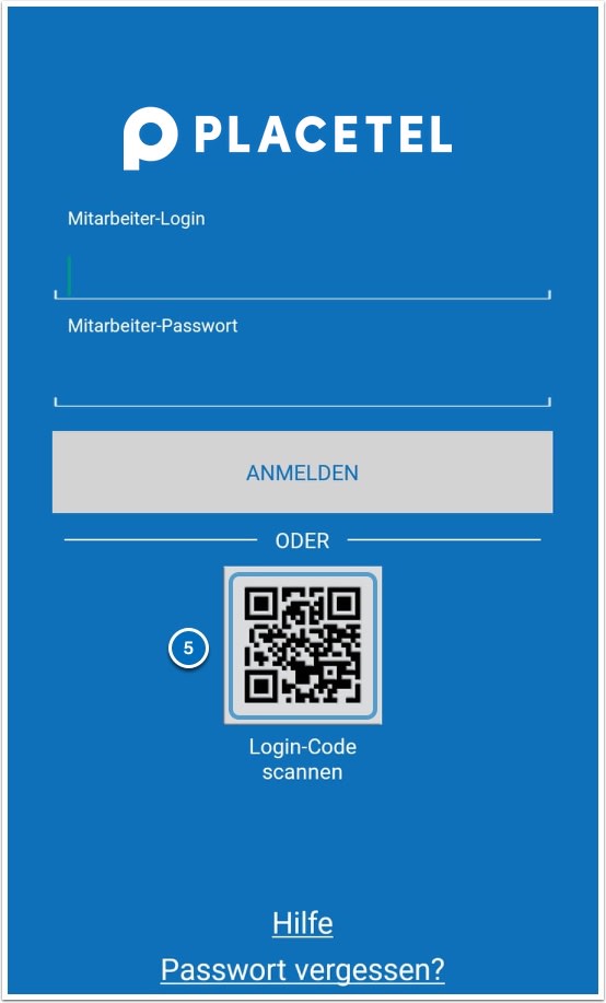 Sollte die Einrichtung mit dem Scan des QR Codes nicht möglich sein, können Sie in die Felder der App auch die Logindaten des Mitarbeiters eingeben. Bitte beachten Sie, dass die Login-Daten nicht automatisch der Mailadresse entsprechen müssen. Schauen Sie im Zweifelsfall auf der Konfigurationsseite des Mitarbeiters nach, wie die Login-Daten lauten. Das Kennwort ist das Kennwort, dass der Mitarbeiter auch nutzt um sich im Placetel WebPortal anzumelden.