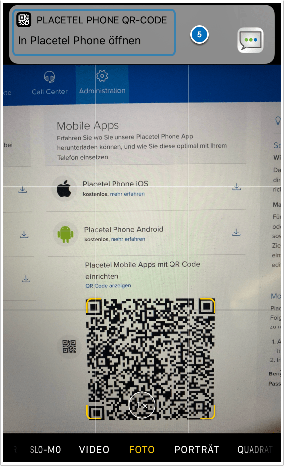 - Öffnen Sie die Apple Kamera App und und scannen Sie den QR Code. Öffnen Sie den betreffenden Link mit der Placetel App.