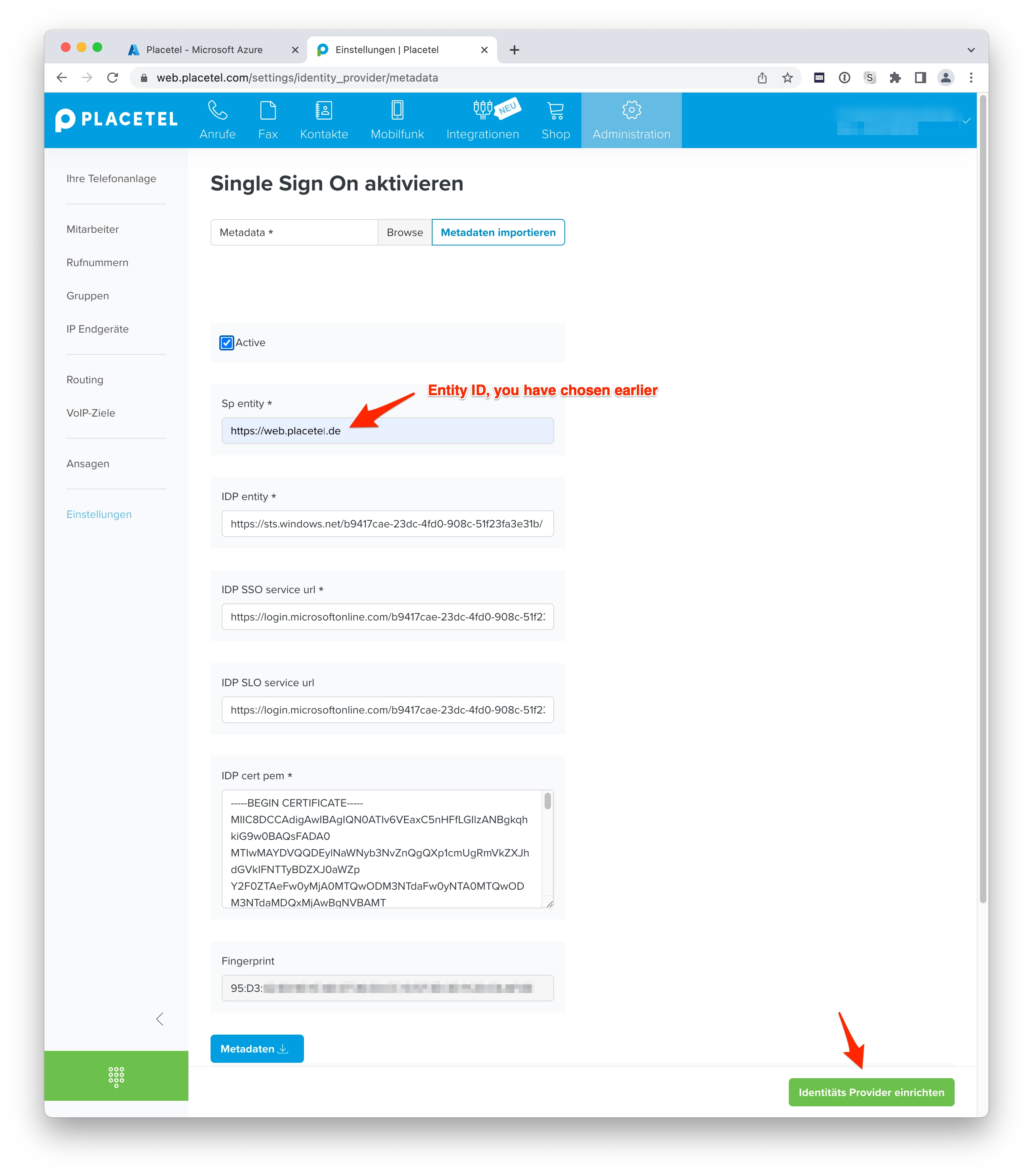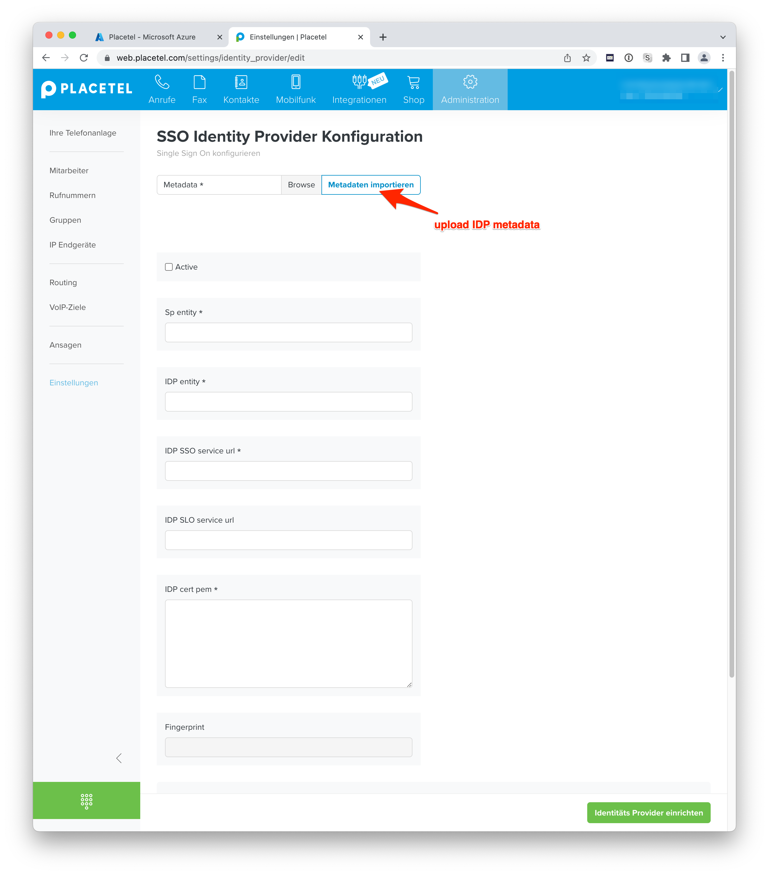 Placetel: Metadata importieren - Tragen Sie als SP entity https://web.placetel.de ein.