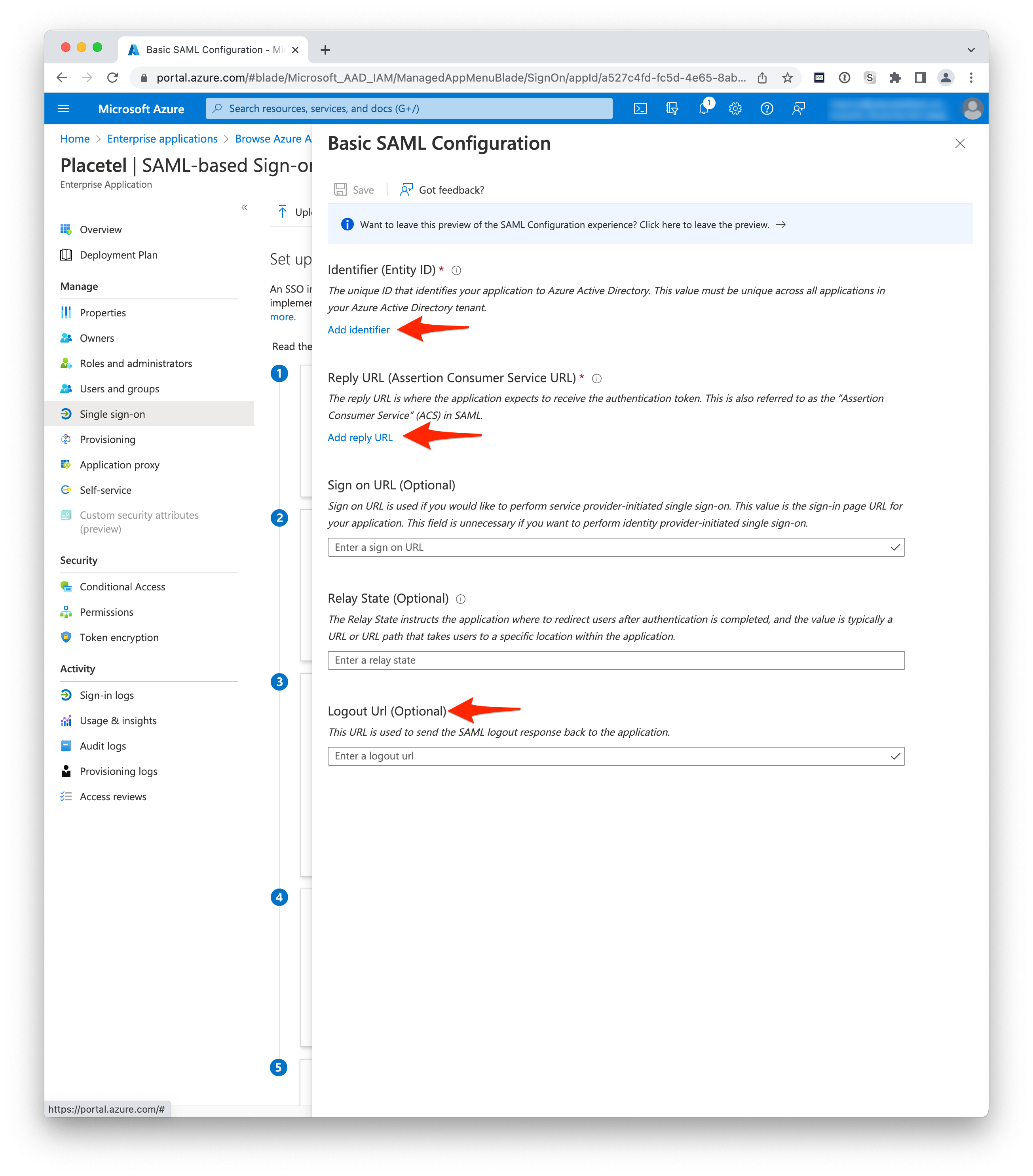 Microsoft: SAML auswählen - Editieren Sie die Basic SAML Parameter. Tragen Sie folgende Daten ein: