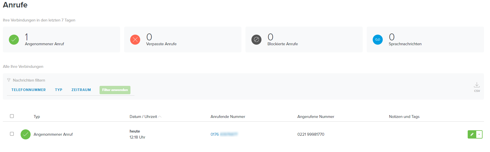 Klicken Sie auf Übersicht Ihrer Anrufe und Sprachnachrichten um eine detaillierte Übersicht über alle Anrufe während der Testphase zu erhalten.