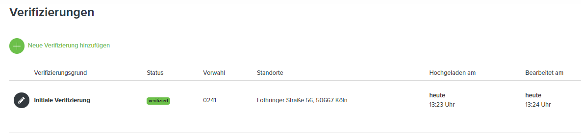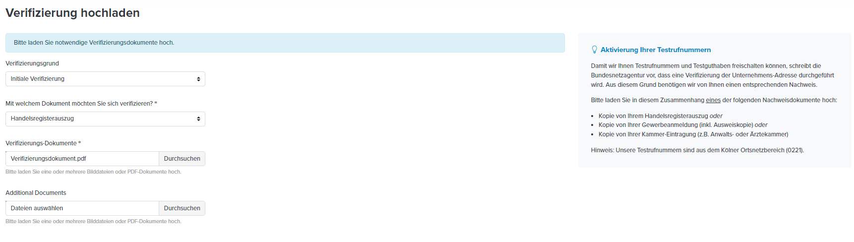 Verifizierung Ihrer Unternehmensadresse und Testrufnummern freischalten