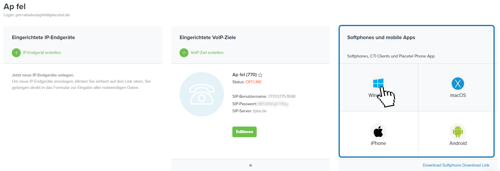 Klicken Sie in der Mitarbeiterübersicht auf den entsprechenden Mitarbeiter und klicken dann unter Softphones und mobile Apps auf das entsprechende Betriebssstem.
