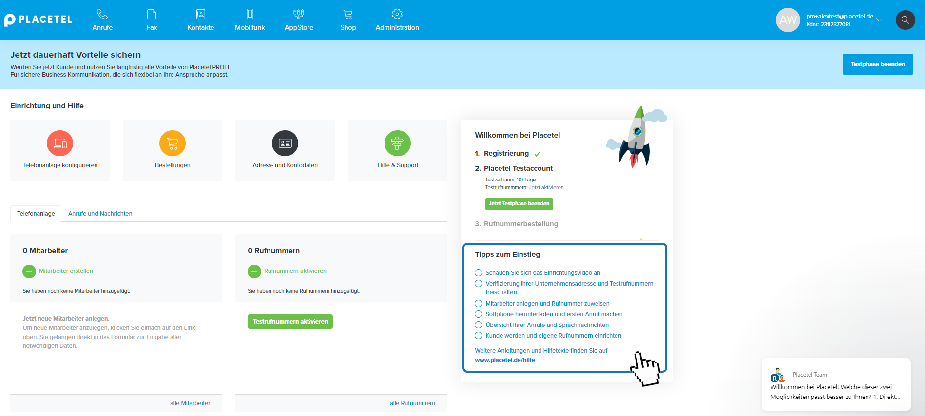 In diesem Artikel beschreiben wir Ihnen, welche Funktionalitäten Sie in Placetel Profi in der Testphase zur Verfügung haben und wie Sie diese nutzen können.