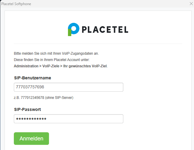 Nachdem Sie die Testphase gestartet und sich registriert haben, können Sie sich mit Ihren Anmeldedaten bei Placetel Profi einloggen.