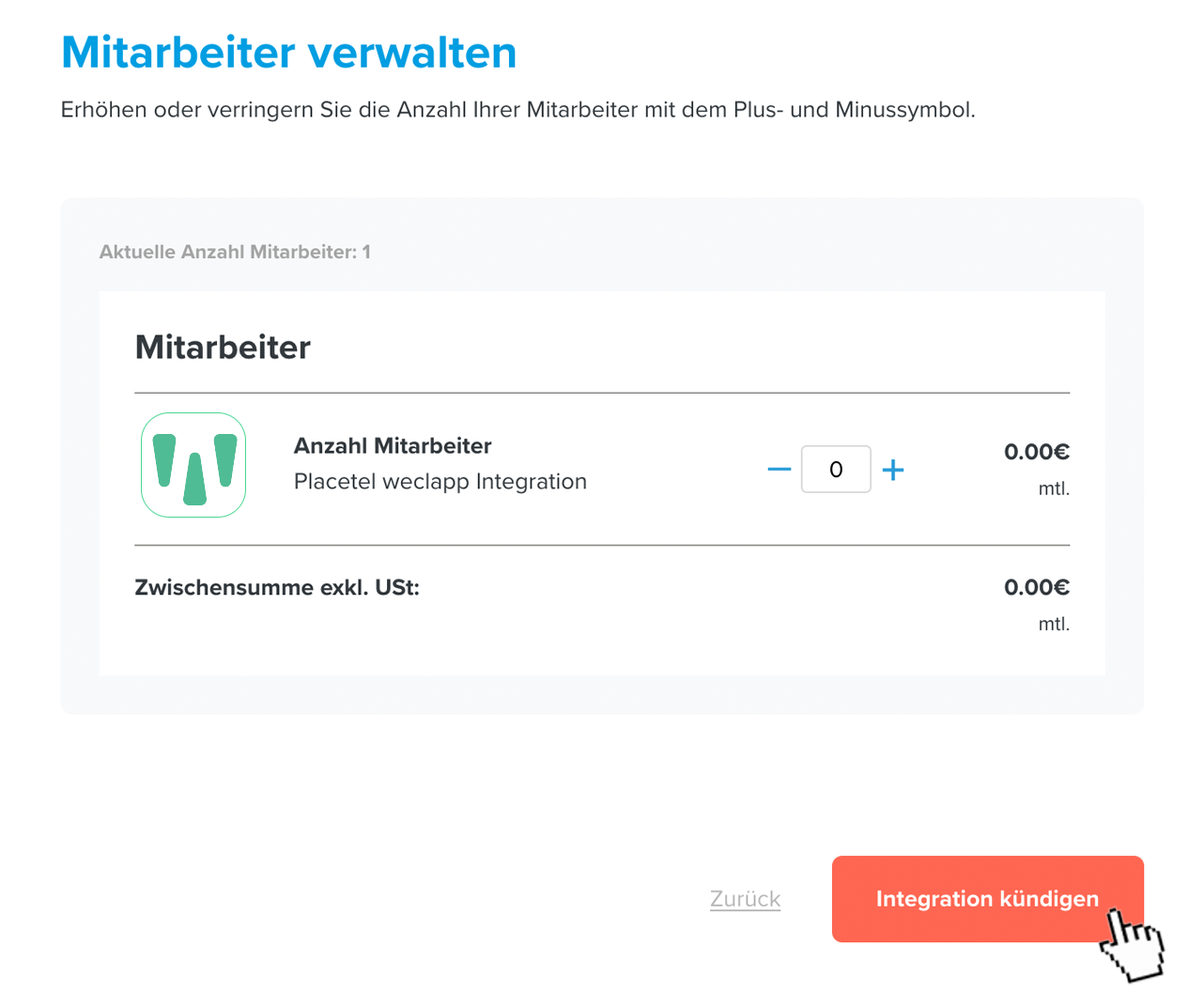 Placetel: Mitarbeiter verwalten - Senken Sie Sie die Anzahl der gewünschten Mitarbeiter auf Null.
