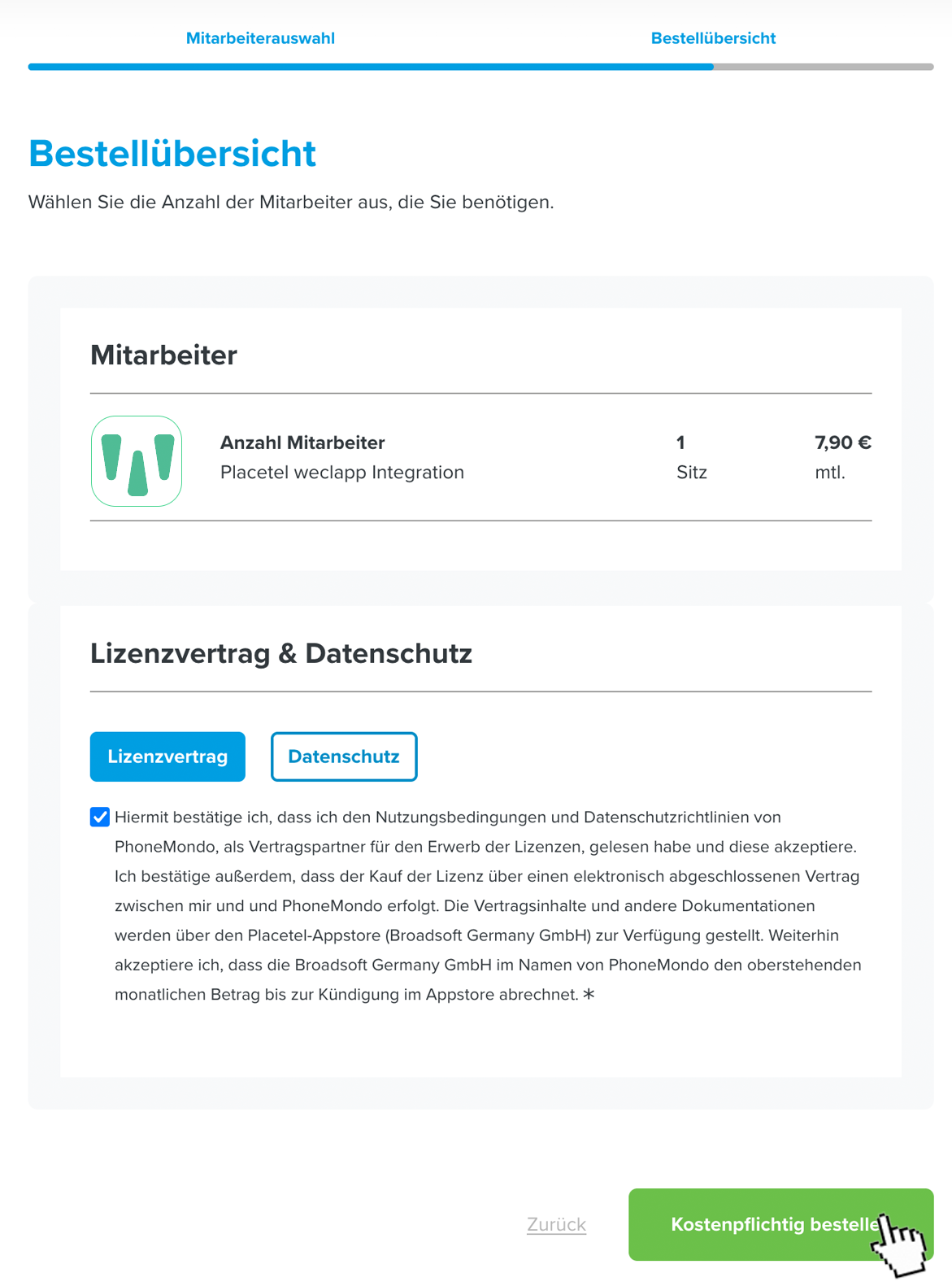 Placetel: weclapp buchen - Placetel: Akzeptieren Sie den Lizenzvertrag und klicken Sie auf kostenpflichtig bestellen.