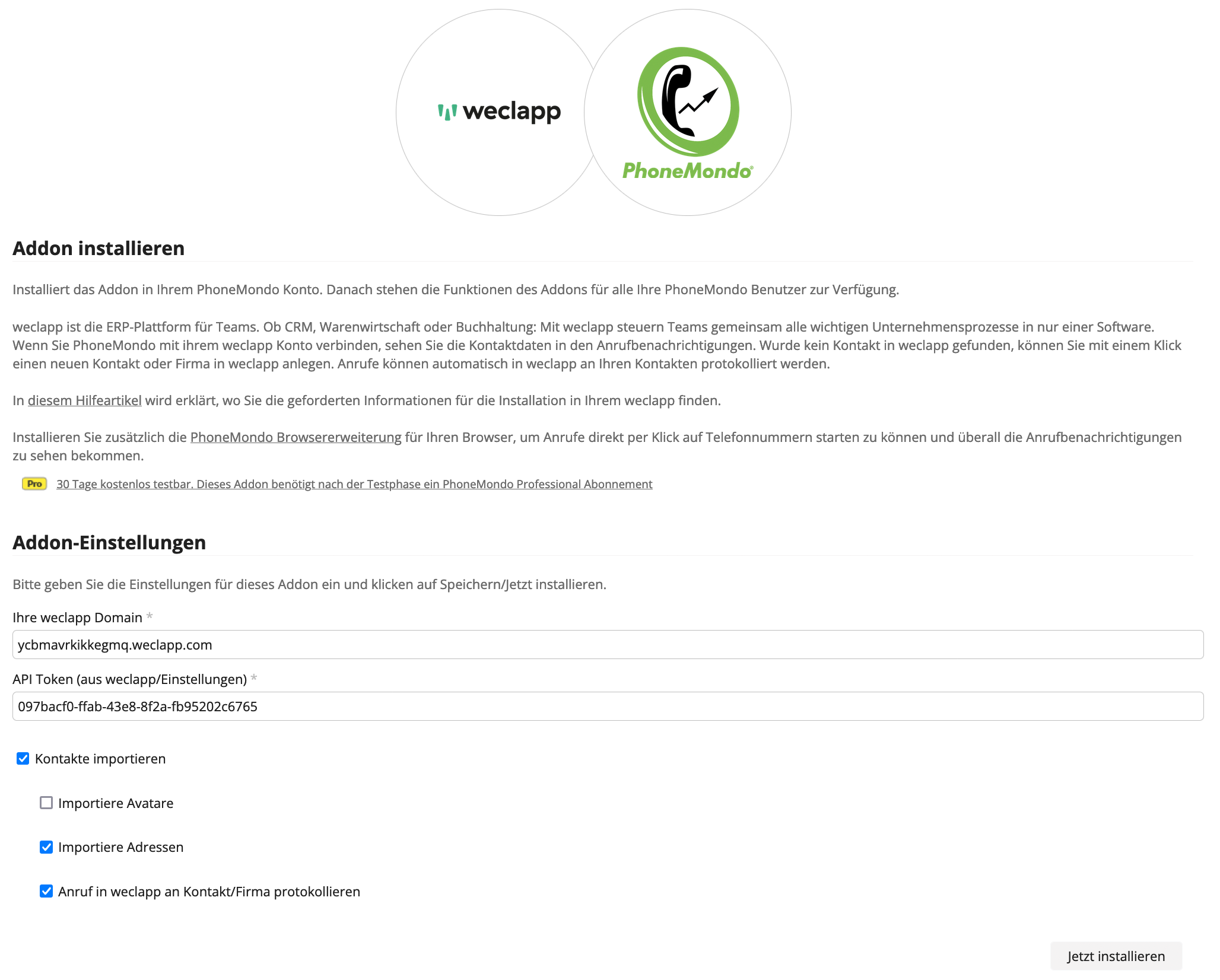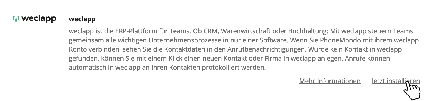 PhoneMondo: weclapp AddOn einrichten - PhoneMondo: Klicken Sie auf Jetzt installieren.