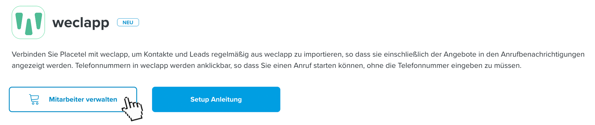 - Placetel: Wählen Sie Integrationen → weclapp by PhoneMondo