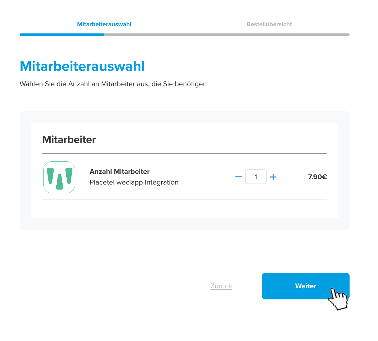Placetel: weclapp auswählen - Placetel: Wählen Sie die Anzahl der Mitarbeiter, die Sie buchen möchten. Sie können die Anzahl später im Rahmen der Kündigungsfristen erhöhen oder senken.