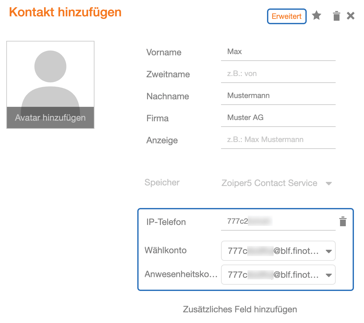 - Klicken Sie auf Erweitert und ergänzen Sie alle notwendigen Informationen. Fügen Sie anschließend eine Telefonnummer vom Typ „IP-Telefon“ hinzu. Geben Sie die SIP-Kennung (777…) des zu überwachenden VoIP Ziels an. Nutzen Sie als Wähl- und Anwesenheitskonto Ihr Placetel-Konto aus. Speichern Sie anschließend.