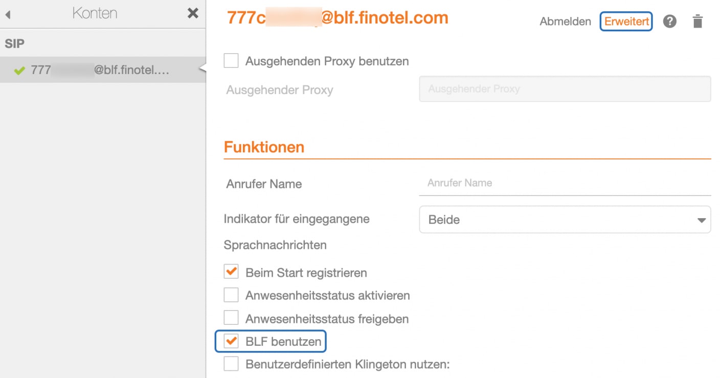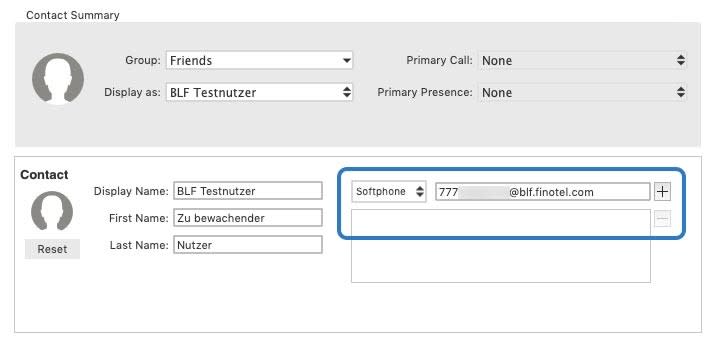 - Ergänzen Sie neben „Softphone“ das zu überwachende VoIP Ziel in der Form sipuser@blf.finotel.com und klicken Sie „+“.