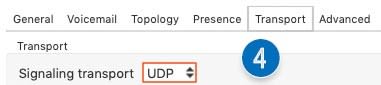 - Klicken Sie bitte auf den Reiter Transport und stellen Sie den Punkt Signaling transport auf UDP. Bestätigen Sie mit OK.