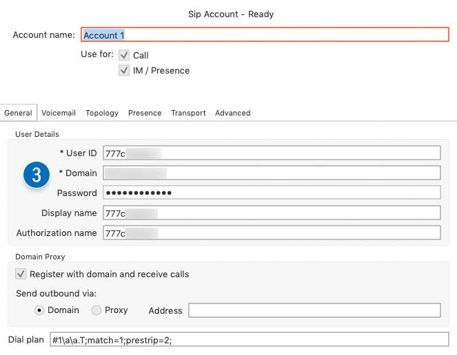 - Unter User ID und Authorization Name tragen Sie bitte Ihren SIP-Benutzernamen ein. Für das Feld Passwort benötigen Sie Ihr SIP-Passwort. Diese Daten finden Sie in den Einstellungen Ihres VoIP-Ziels.