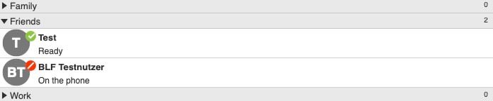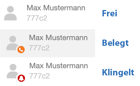 - Sie können den BLF Status jetzt in Ihrer Kontaktliste erkennen. Bitte beachten Sie: Sofern der Teilnehmer nicht den Status „Belegt“ oder „Klingelt“ hat, wird kein Icon angezeigt. Hier unterscheidet sich Zoiper zu anderen Softphones.
