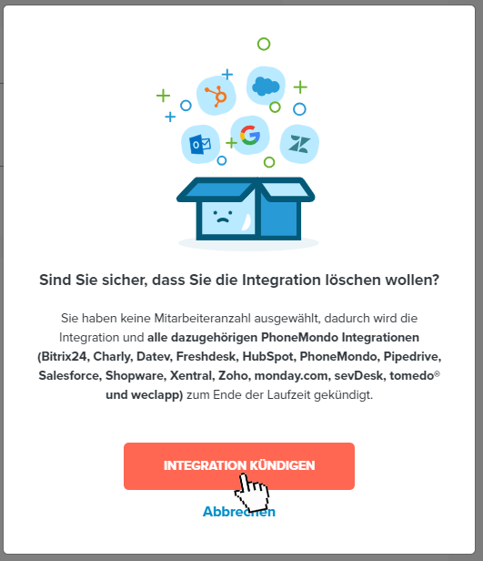 Placetel: Integration kündigen - Klicken Sie auf Integration kündigen.