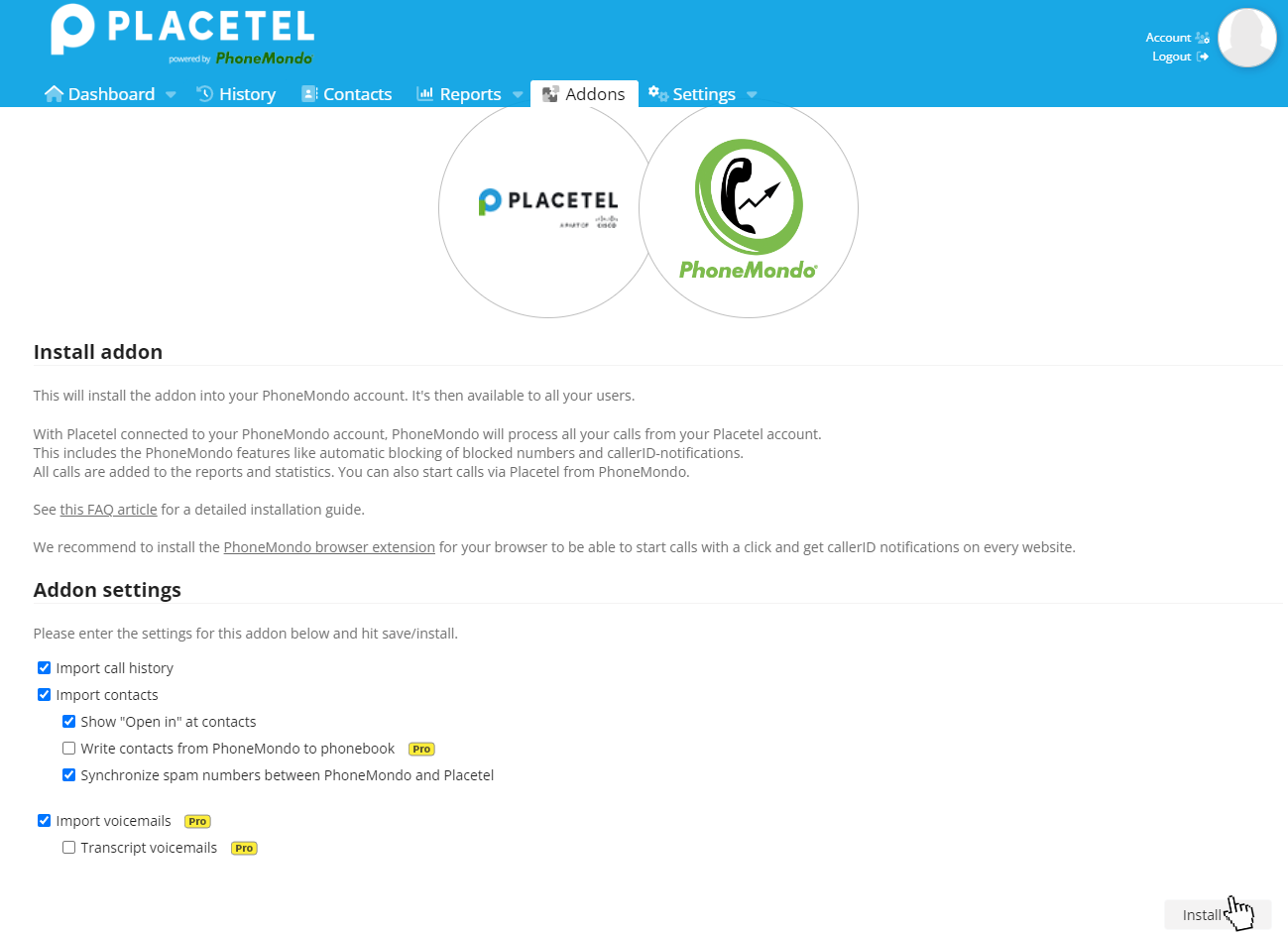 PhoneMondo: Add-On Einstellungen sichern - PhoneMondo: Hier wird Ihnen direkt die ausgewählte Integration zur Installation angeboten.