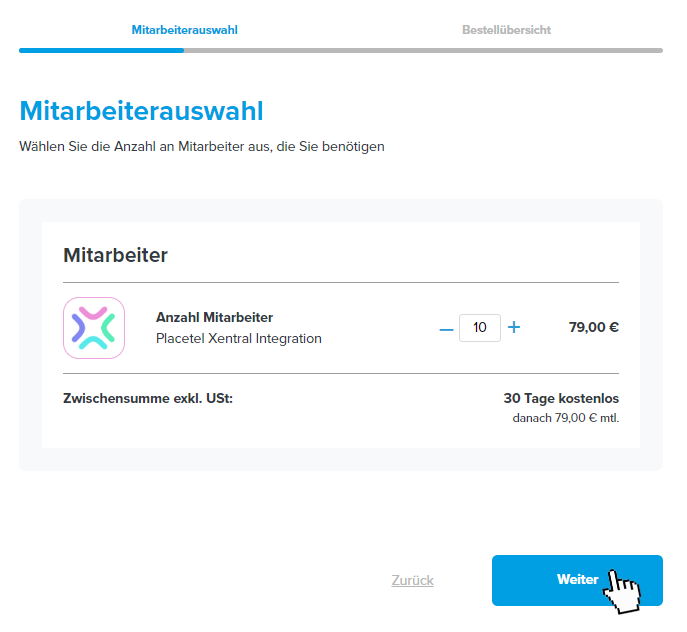 Placetel: Xentral auswählen - Placetel: Wählen Sie die Anzahl der Mitarbeiter, die Sie buchen möchten. Sie können die Anzahl später im Rahmen der Kündigungsfristen erhöhen oder senken.