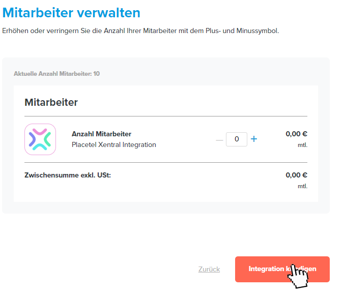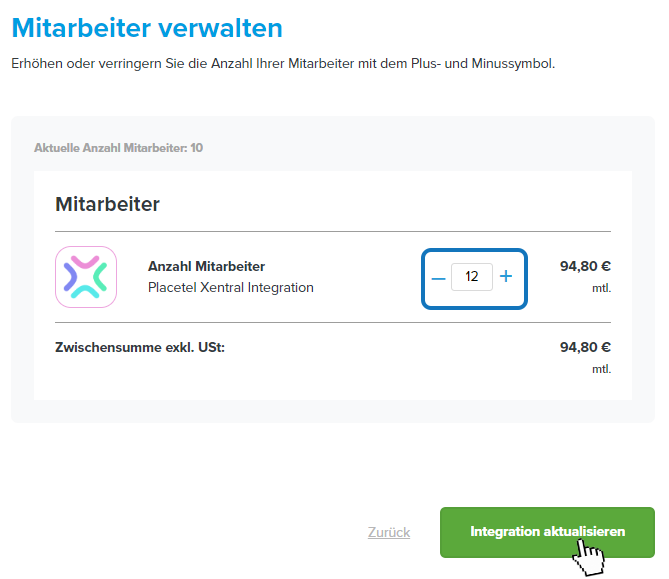 Placetel: Mitarbeiter verwalten - Placetel: Erhöhen Sie die Anzahl der gewünschten Mitarbeiter.