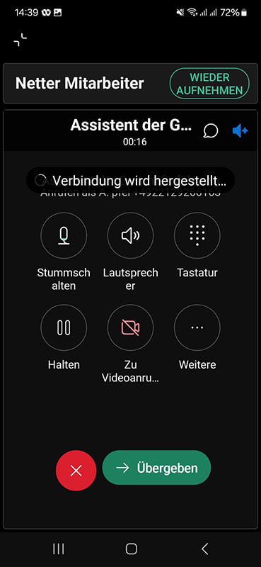 Um dann einen Anruf durchzustellen, klciken Sie auf Übergeben. Um zu dem ursprünglichen Gesprächsteilenehmer zurückzukehren, klicken Sie auf Wiederaufnehmen.