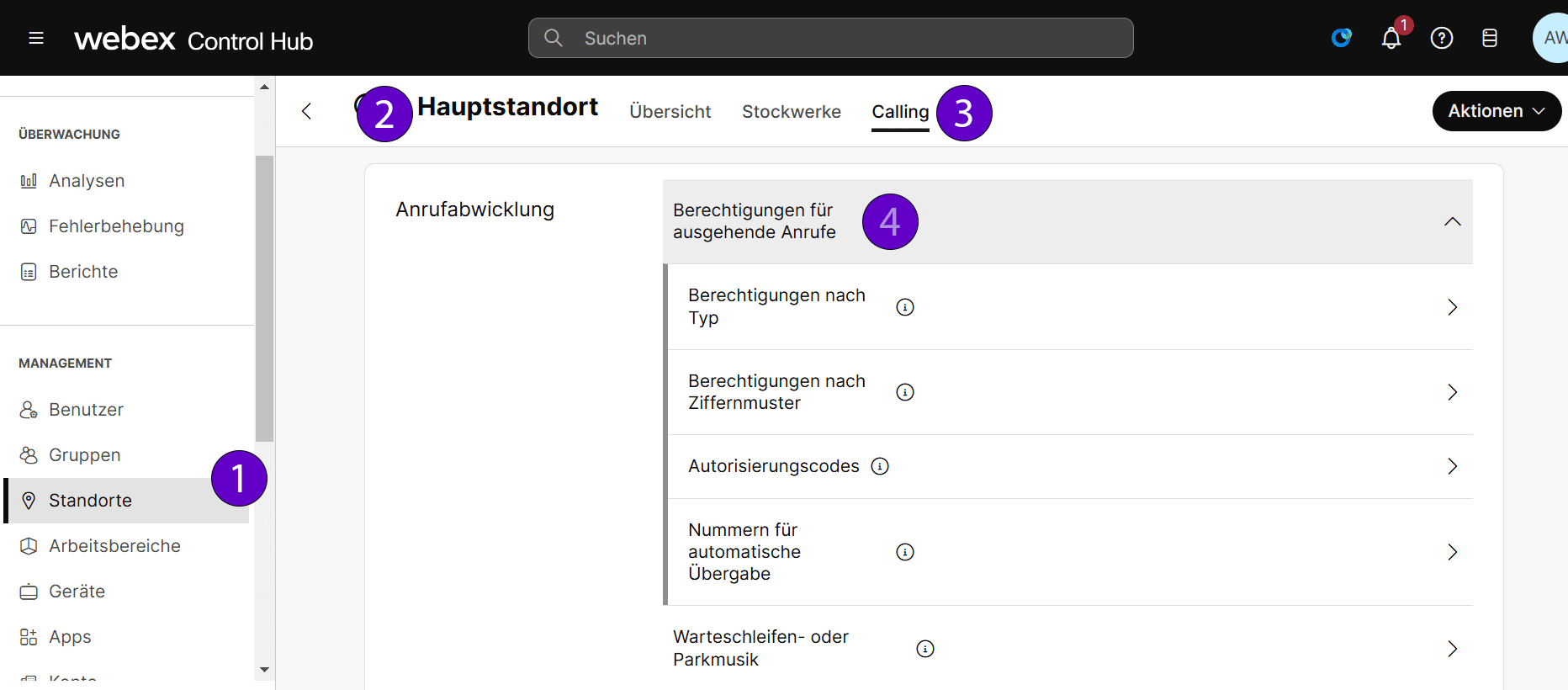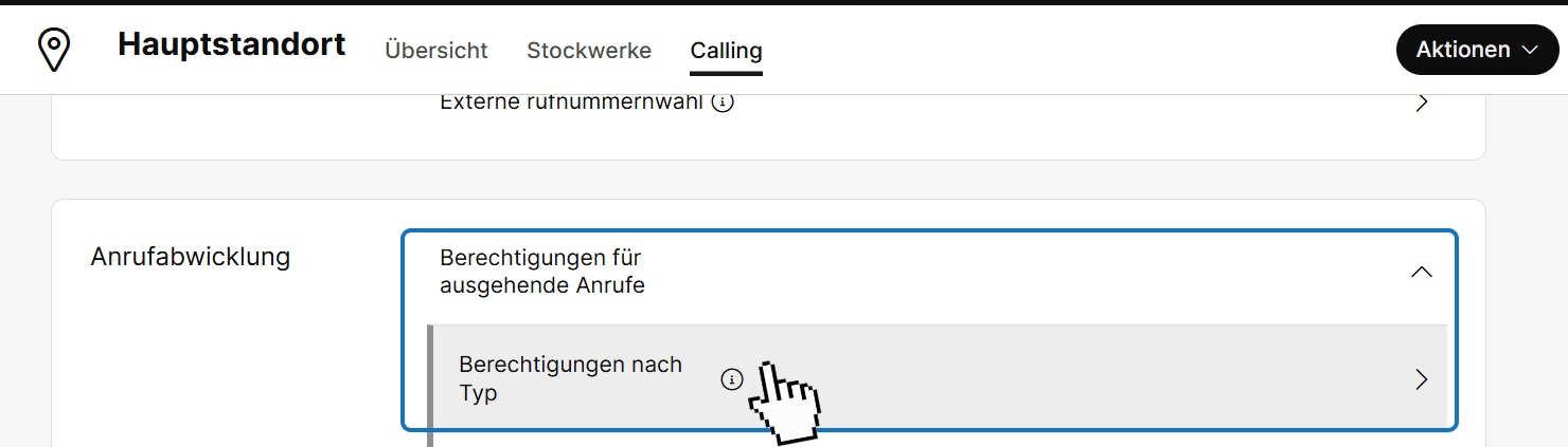 4.) Scrollen Sie herunter zu dem Bereich Anrufabwicklung. Hier klicken Sie auf Berechtigung für ausgehende Anrufe.