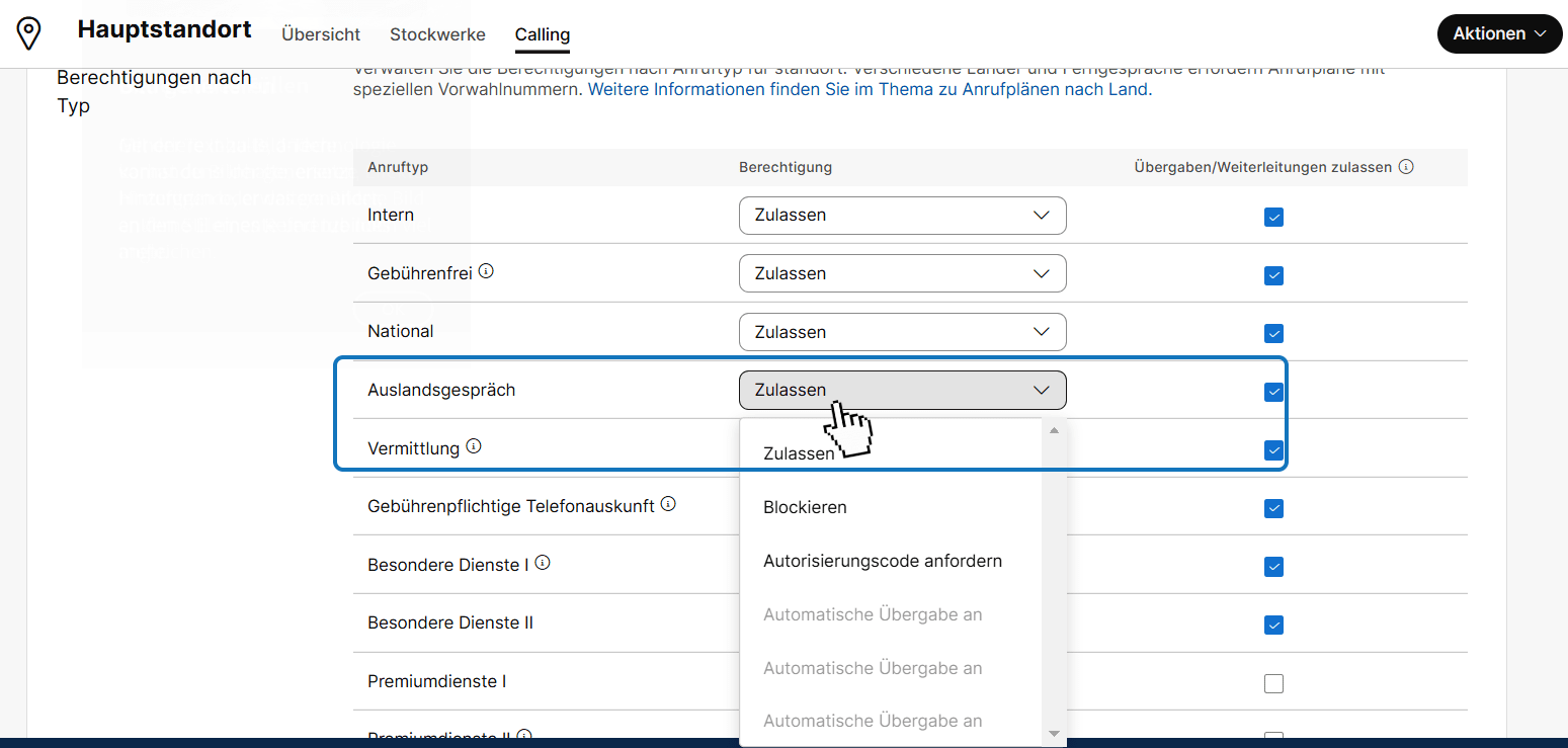 Hier können SIe dann die Option Zulassen auswählen, um Anrufe ins Ausland zu genehmigen.