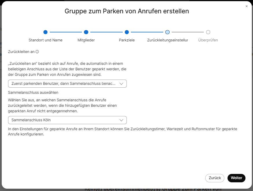 Zurückleitungseinstellungen - Geben Sie nun an, wohin geparkte Anruf zurückgeleitet werden (innerhalb der anzulegenden Gruppe). Die Zeiten die hier gelten, sind die, die in den Grundeinstellungen (s.o.) festgelegt wurden.