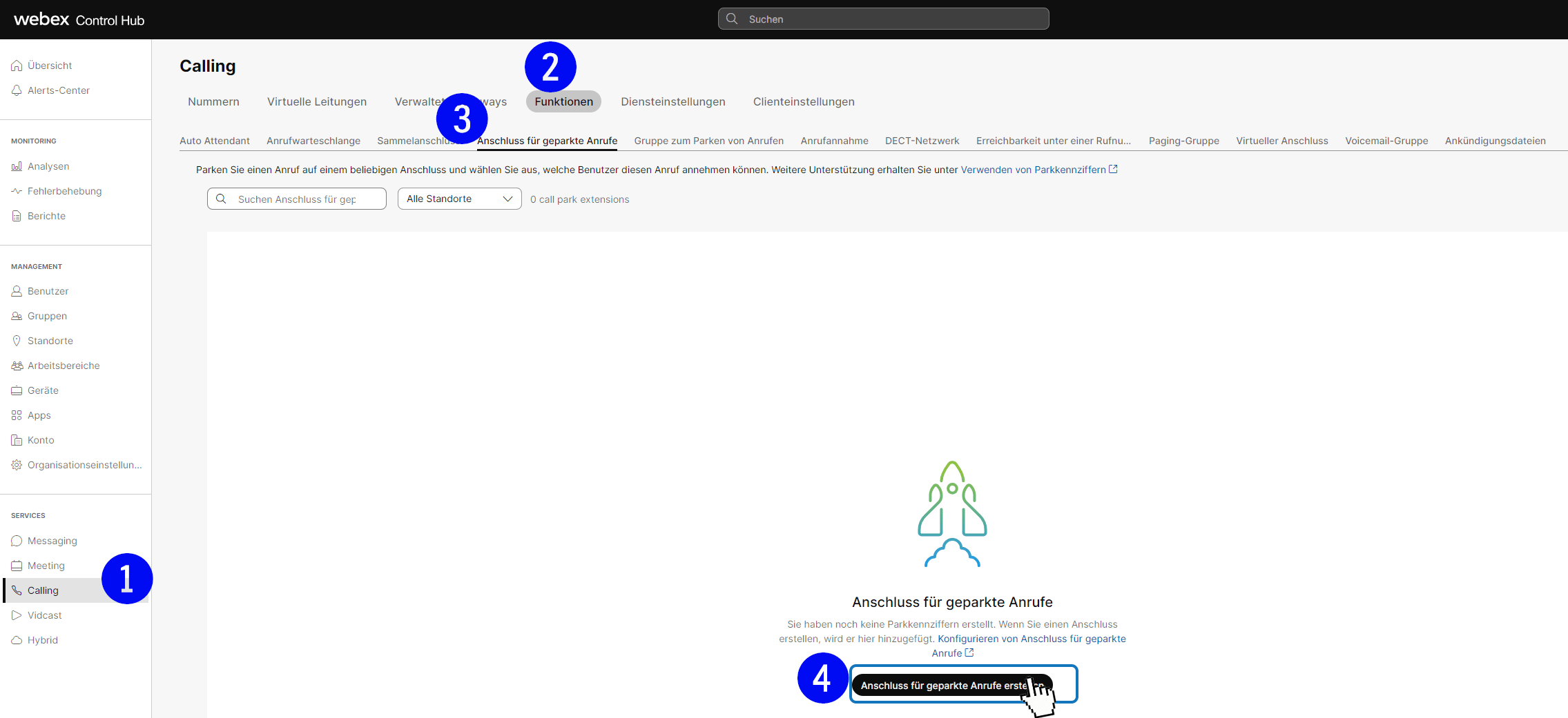 Services: Calling ➔ Funktionen ➔ Anschluss für geparkte Anrufe ➔ Anschluss für geparkte Anrufe erstellen.