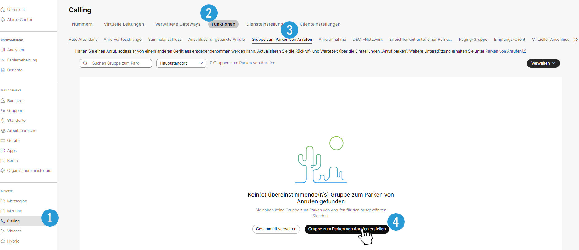 1.) (Management: Standorte → Auswahl Hauptstandort → Reiter: Calling → Einstellungen des geparkten Anrufs)