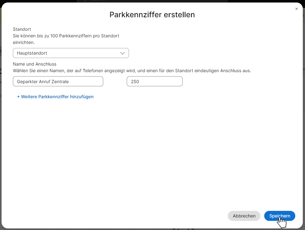 Legen Sie nun eine Kennziffer fest, die als Durchwahl für das Parken von Anrufen genutzt werden soll.