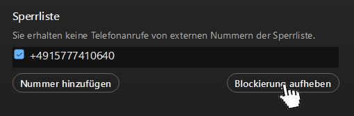 Um eine Rufnummer von der Sperrliste zu nehmen, klicken Sie auf die entsprechende Nummer und wählen dann Blockierung aufheben.