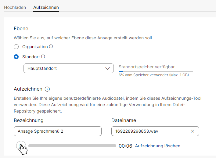 Sollten Sie bereits eine Audio Datei (die Sie vorher aufgenommen haben) zur Verfügung haben, so können Sie diese im Reiter Hochladen hochladen.