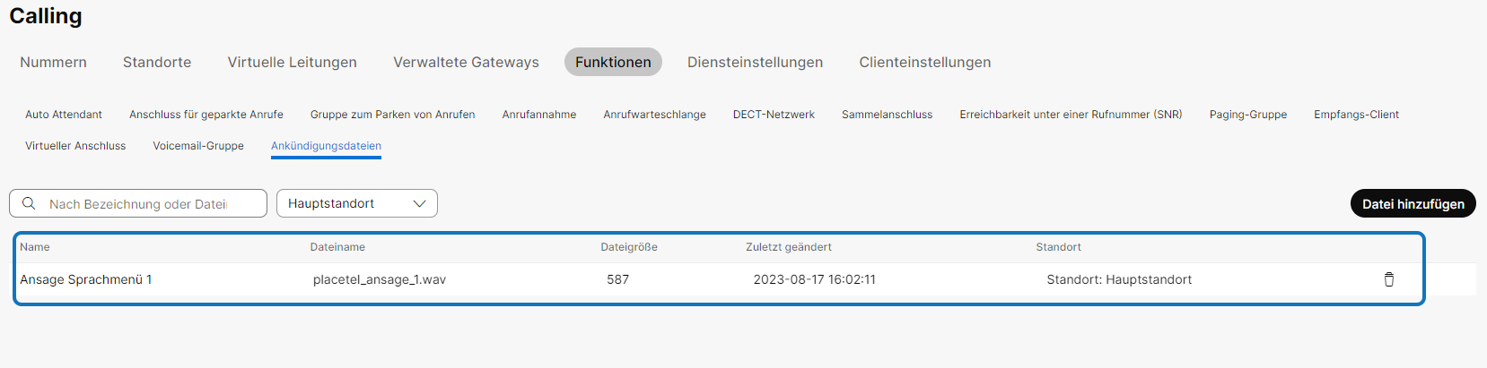 Webex für Placetel bietet Ihnen die Möglichkeit, vorgefertigte Ansagen zu verwenden oder Ihre eigenen Ansagen hochzuladen, um diese dann ganz einfach für Begrüßungen, Sprachmenüs oder die Mailbox zu nutzen.