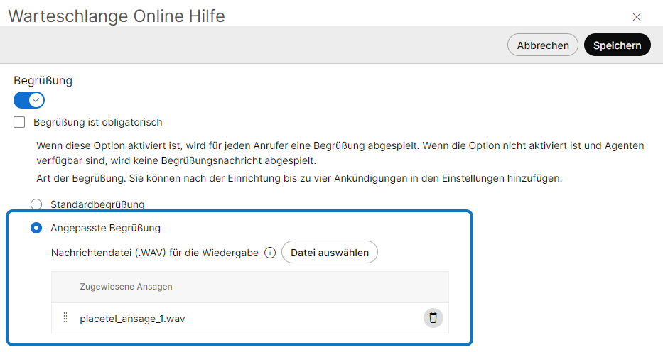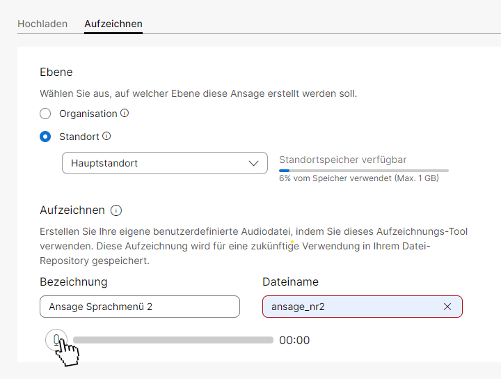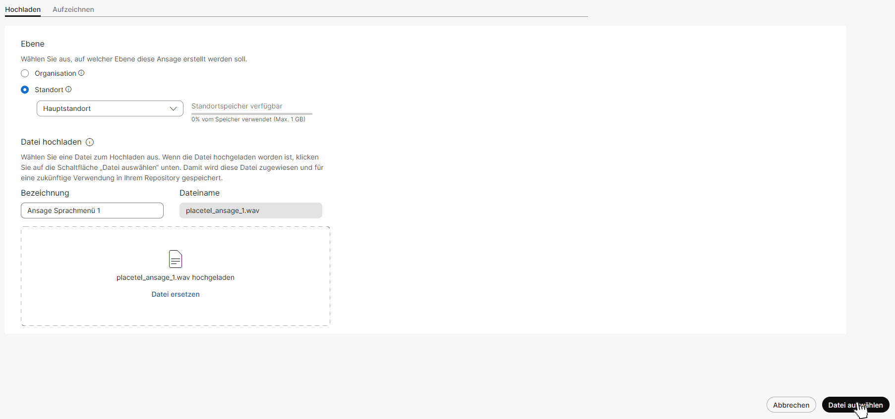 Bei Datei hochladen geben Sie unter Bezeichnung Ihrer Audio-Datei einen Namen. Über **Datei auswählen, können Sie eine Ansagen-Datei von Ihrem Computer auswählen.