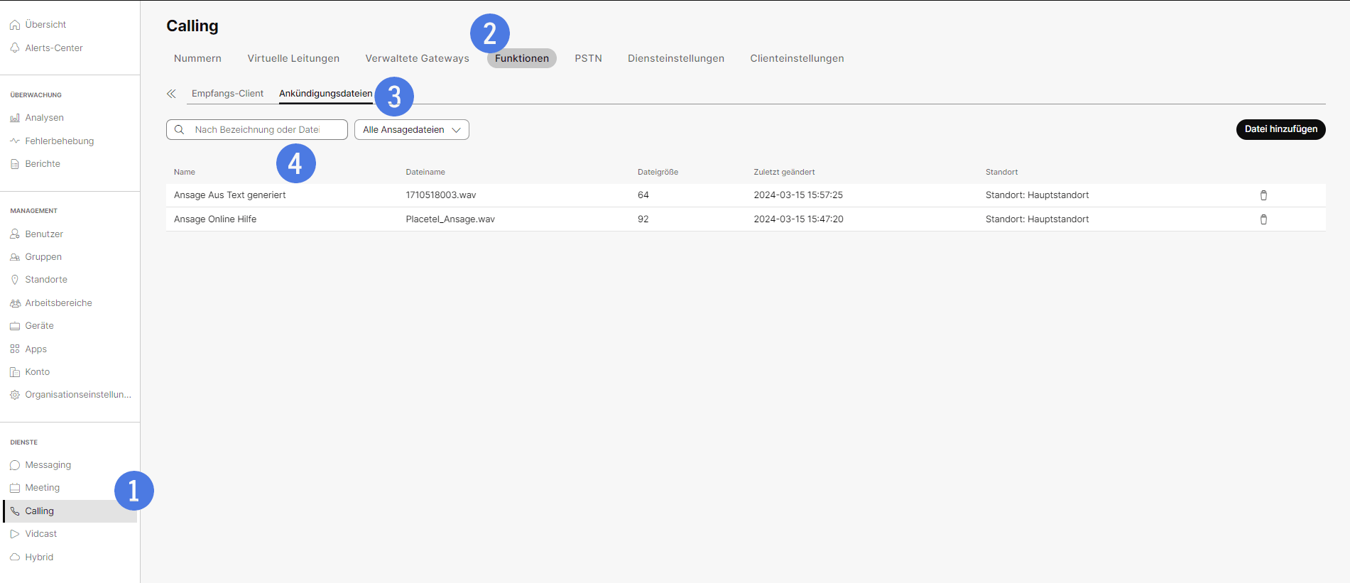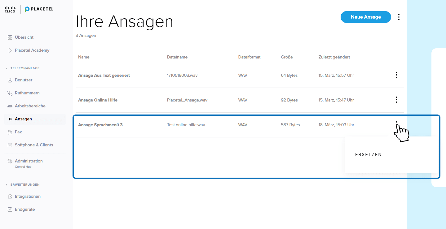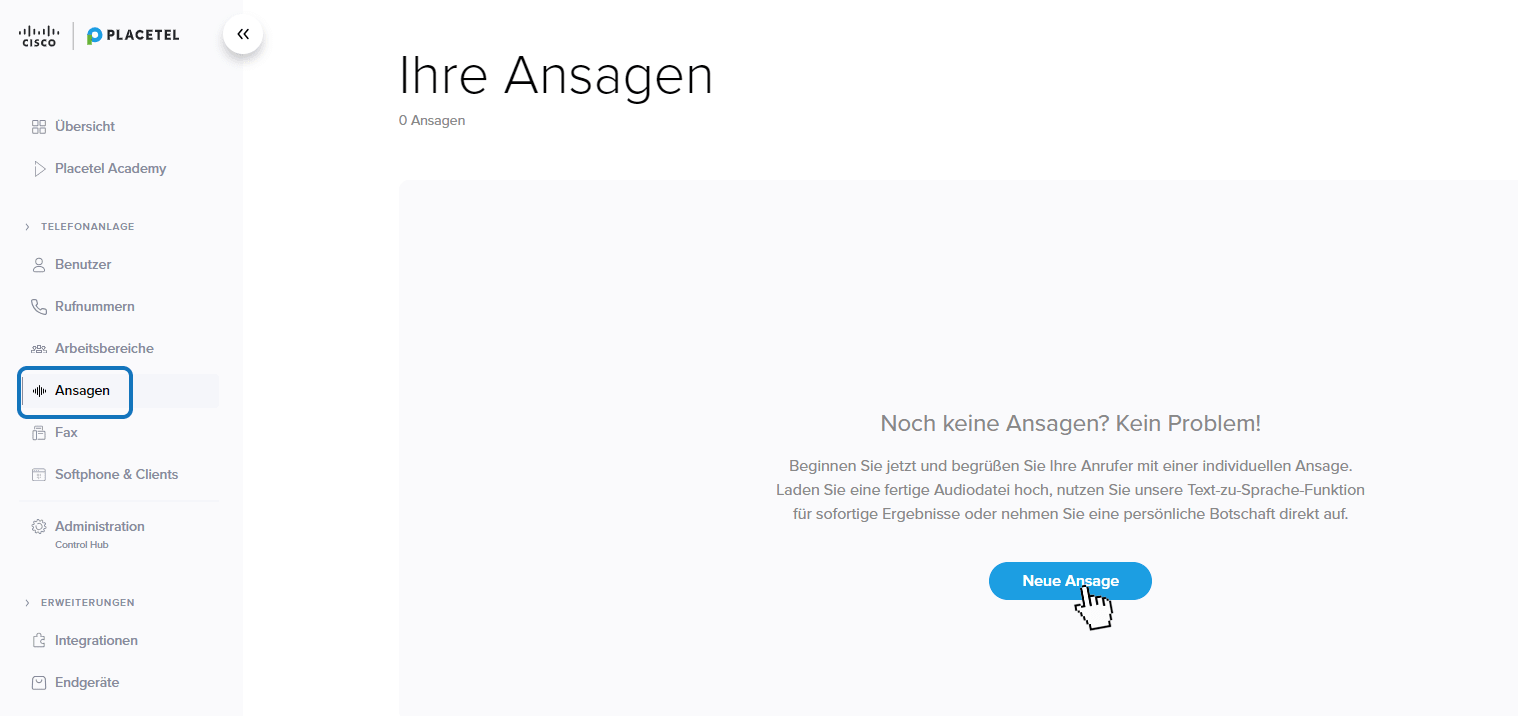 Ansagen, die über den Control Hub hochgeladen werden, werden auch in das Placetel Order Portal synchronisiert.
