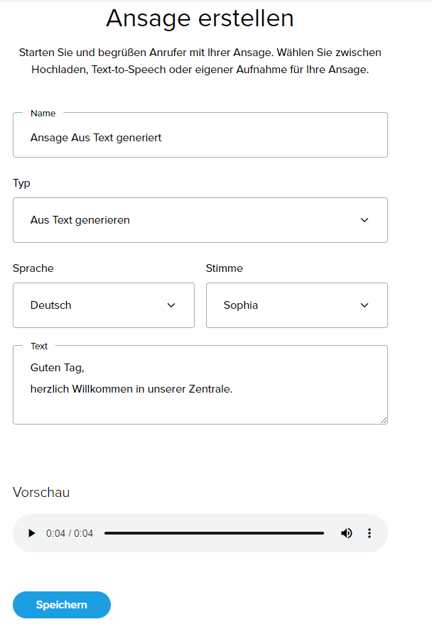 Sie erhalten dann eine Vorschau und können diese über den Play-Button abspielen. Über die weiteren Optionen (die 3 Punkte) können Sie die Ansage auch herunterladen, oder die Wiedergabegeschwindigkeit ändern.