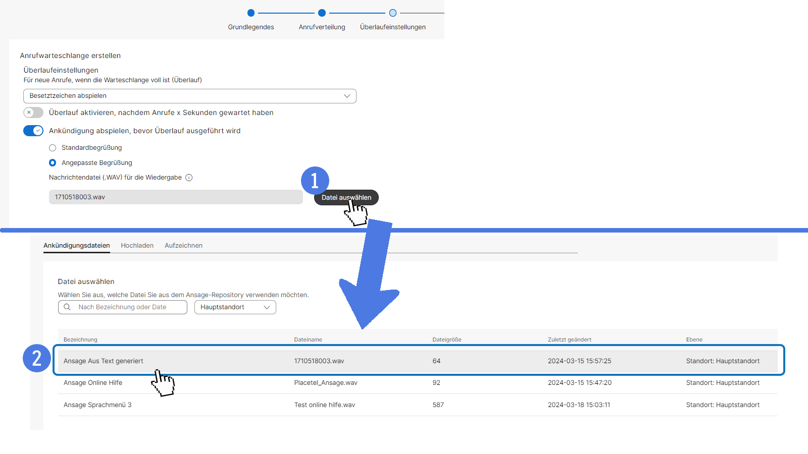 In einer Anrufwarteschlange können Sie beispielsweise eine Ansage abspielen lassen, wenn ein Anrufüberlauf (mehr Anrufer, als in Warteschlange zugelassen) vorliegt. Hier können Sie auuch die Ansagen verwenden, die Sie im Order Portal aufgenommen haben.