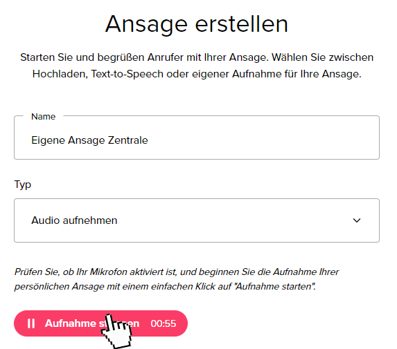 Es ist ebenfalls möglich eine eigene Ansage aufzusprechen. Dafür nutzen Sie den Typ Audio aufnehmen.