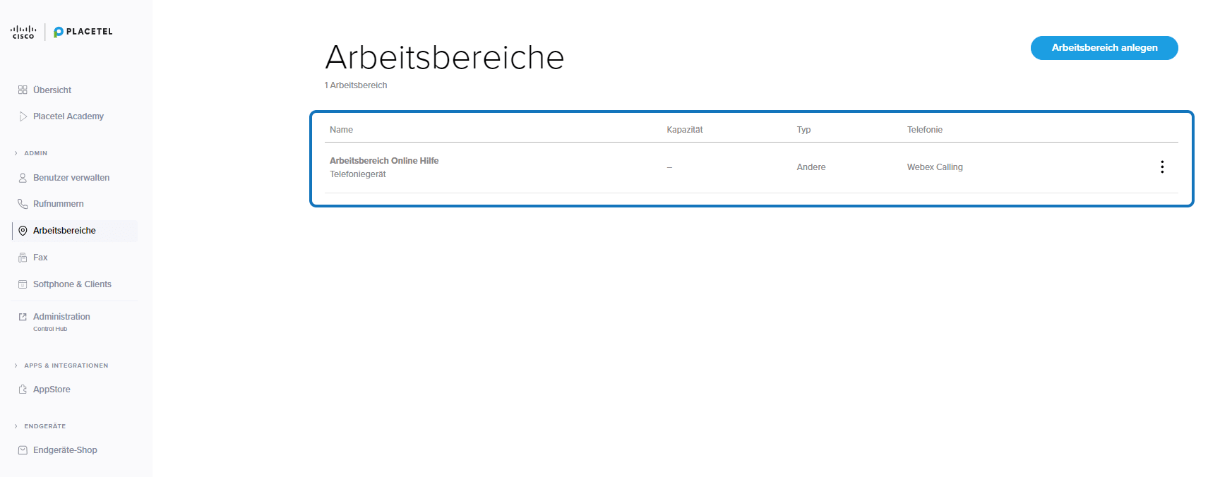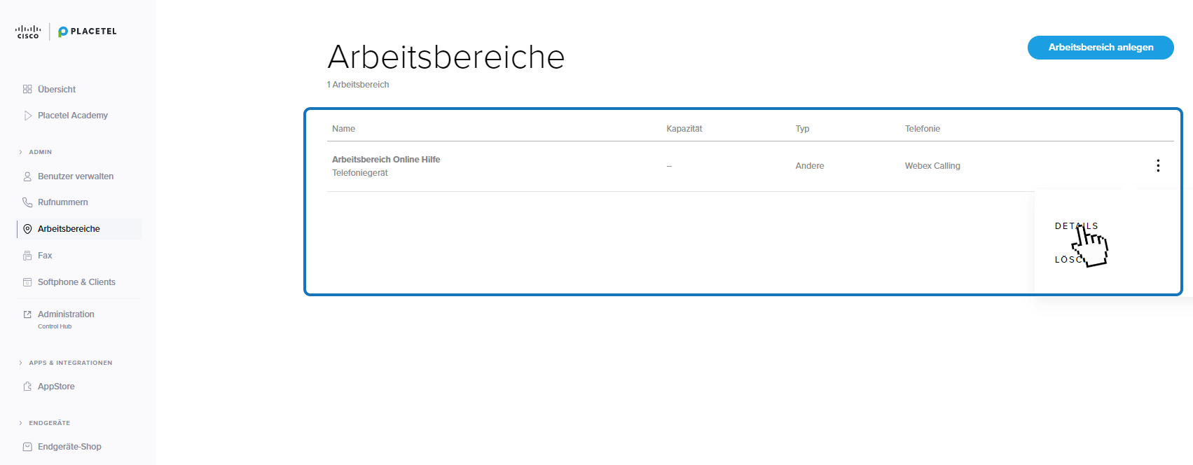 Klicken Sie im Placetel Order Portal, in der Arbeitsbereiche Übersicht auf Details, um direkt zu den Einstellungen des Arbeitsbereichs im Control Hub weitergeleitet zu werden.