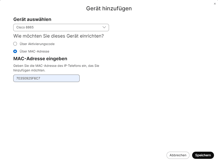 Wählen Sie in der Dropdown-Liste das entsprechende Endgerät und geben Sie entweder die MAC-Adresse oder einen Aktivierungscode ein, um das Endgerät zu aktivieren.