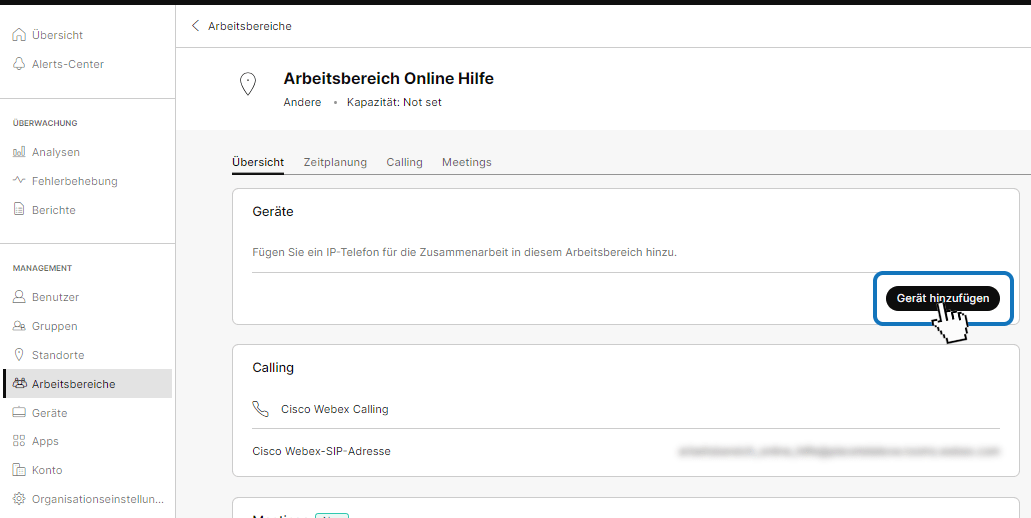 - Um Arbeitsbereiche (Workspaces) nutzen zu können, müssen Sie zuerst eine SIP-Adresse im Control Hub eingerichtet haben.