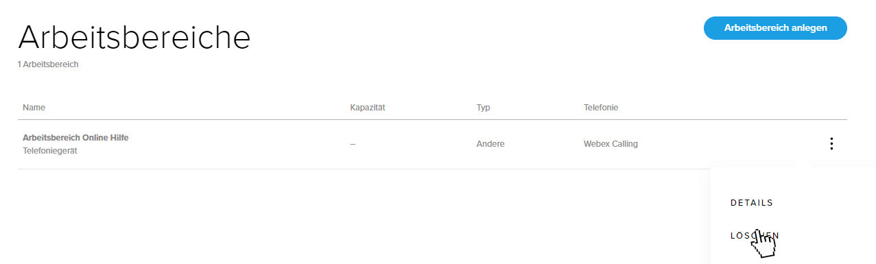 Klicken Sie dann bei dem entsprechenden Arbeitsbereich auf Löschen.